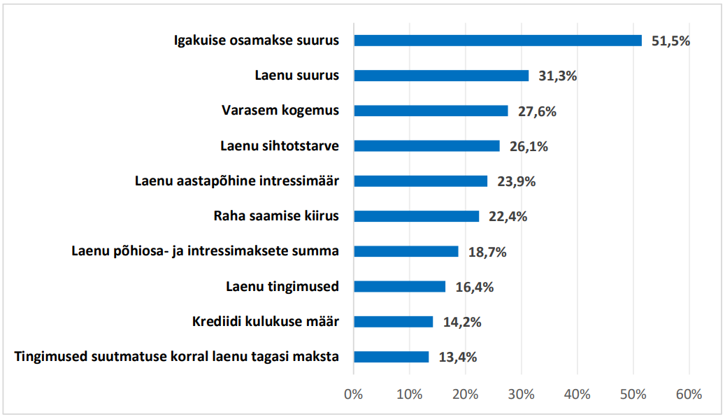 Laenu aastast intressimäära peab oluliseks 23,9% vastanutest, samas kui krediidi kulukuse määra (KKM) ainult 14,2%. See näitab, et laenu valikul keskendutakse sagedamini üksikutele tingimustele, mitte laenu kogukulule tervikuna.